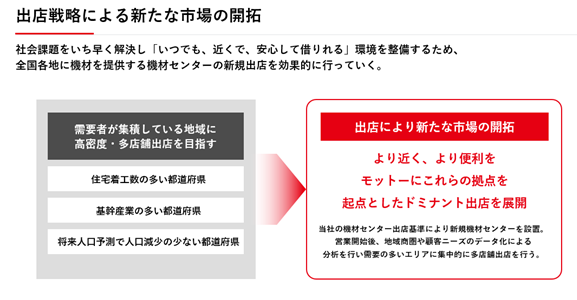 当社は機材センター新規出店時、①住宅着工数の多い都道府県②基幹産業の多い都道府県③将来人口予測で人口減少の少ない都道府県を立地の基準としております。