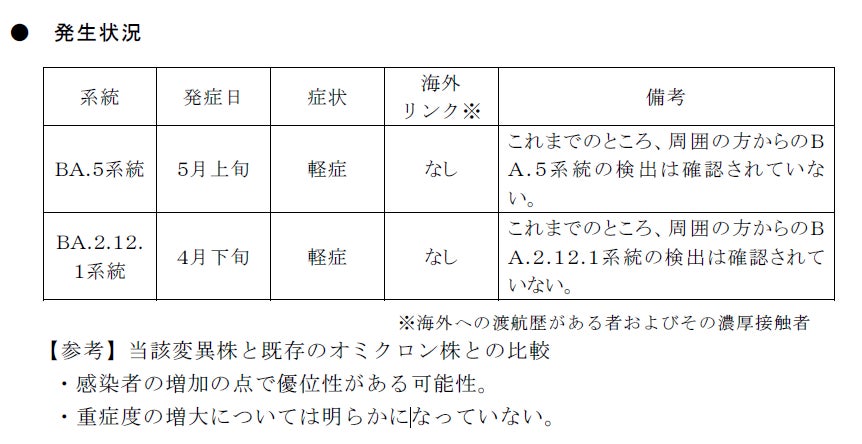この度、健安研等においてゲノム解析を行った結果、都内で初めて、オミクロン株の亜系統である「BA.5系統」1例、「BA.2.12.1系統」1例が確認されたため、下記のとおり、お知らせいたします。