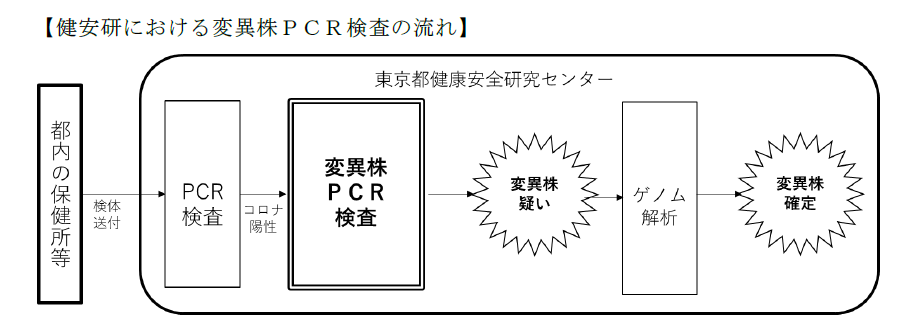 東京iCDCでは、都内での変異株の発生状況を把握するため、「新型コロナウイルスのゲノム解析に関する検討チーム」を立ち上げ、東京都健康安全研究センター(以下、「健安研」という。)等において、都内における遺伝子変異の有無のスクリーニングを実施するとともに、ゲノム解析を行っています。
