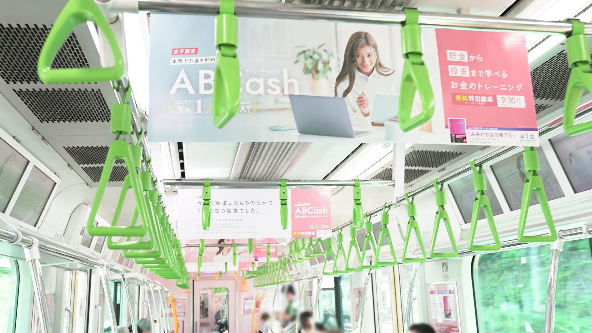 電車内の中吊り、ドア横ポスター、まど上チャンネルなど車両全てを「ABCash」広告にしました。
