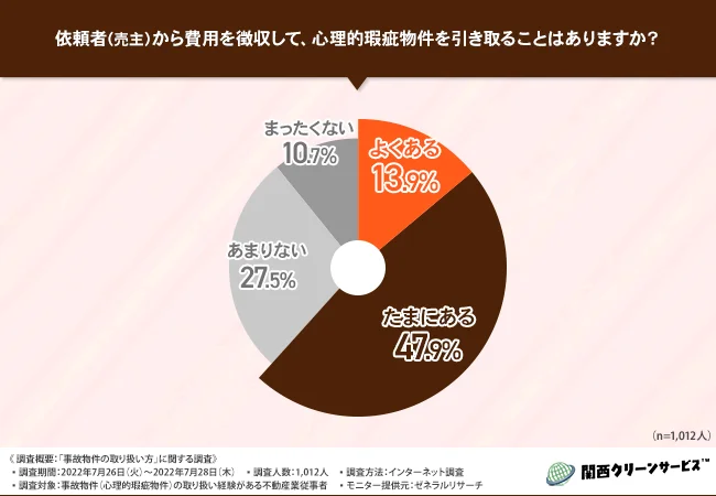 「依頼者(売主)から費用を徴収して、心理的瑕疵物件を引き取ることはありますか?」と質問したところ、『よくある(13.9%)』『たまにある(47.9%)』『あまりない(27.5%)』『まったくない(10.7%)』という回答結果になりました。