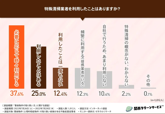 ここまでの調査で、5割以上の方が戸建で建物を解体した場合でも心理的瑕疵のある土地として取り扱う必要があると認識していることが判明しましたが、清掃の際は特殊清掃業者を利用しているのでしょうか。