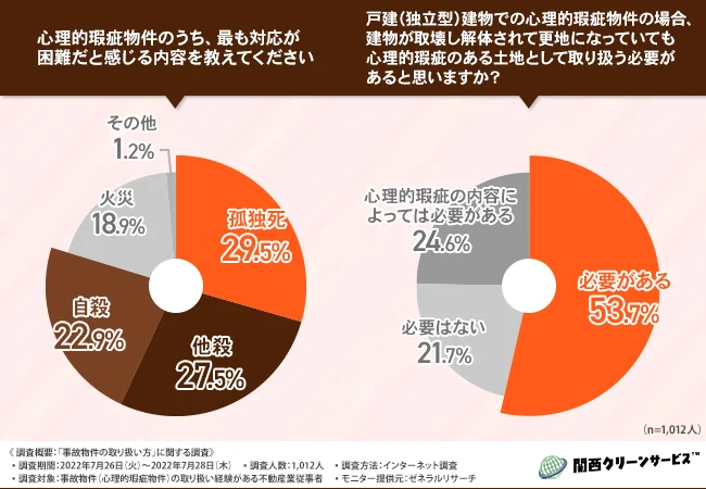 「心理的瑕疵物件のうち、最も対応が困難だと感じる内容を教えてください」と質問したところ、『孤独死(29.5%)』と回答した方が最も多く、次いで『他殺(27.5%)』『自殺(22.9%)』『火災(焼死)(18.9%)』と続きました。