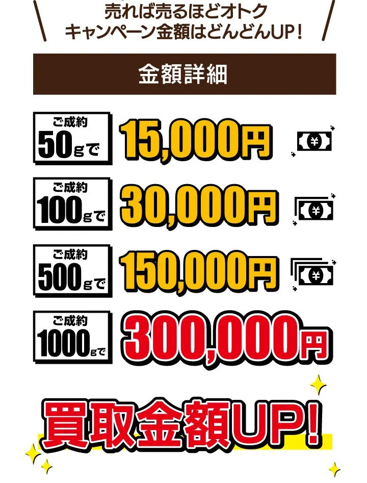 ご成約のお品物が50gで1万5千円、100gで3万円、500gで15万円、1kgで3万円…とグラム(重さ)に応じて買取金額UPが見込めます。