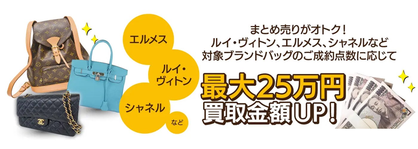 買取専門店おたからやではブランドバッグをまとめてご売却いただくと、その数に応じて最大25万円まで買取金額がUPするキャンペーンを実施中!ブランドバッグを売るなら、おたからやにお任せください!