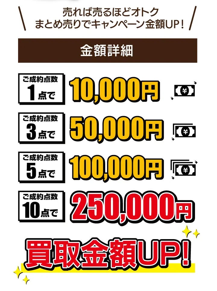 実施中のキャンペーンは対象ブランドのブランドバッグの買取成約点数によって買取金額がUPしていくシステムとなっており、1点で1万円、3点で5万円、5点で10万円、10点以上で最大25万円のUPとなります。