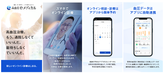 イーメディカルジャパンが提供を開始した「高血圧イーメディカル」は、1:初診から通院不要でオンラインで診療 2:高血圧に特化した専門医療集団 3:アプリと家庭血圧計を使った継続的なモニタリング を実現した新しいオンライン診療サービスです。