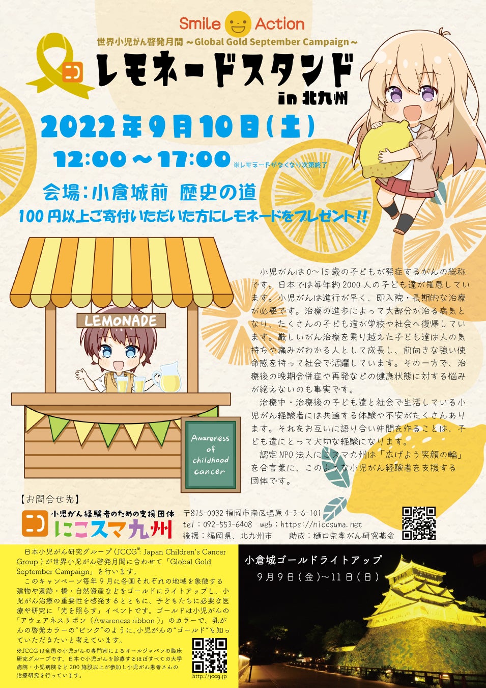 ライトアップ期間である9月10日(土)には小倉城前歴史の道で小児がん啓発活動としてレモネードスタンドを開催いたします。