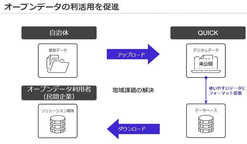 官民データ活用推進基本法の制定以来、政府は「デジタル田園都市国家構想」を掲げて準公共分野でのオープンデータ活用を期待しています。それに伴ってオープンデータを公開する自治体が増加している一方、民間企業にとっては、オープンデータのフォーマットが統一されていなかったり、情報量が不足していることなどから、利用がうまく進められずにいる状況があります。オープンデータが公開されていながら利活用が進まない現状を変えるためには、民間企業が利用しやすい形にデータを加工する必要があり、その役割をQUICKが担ってまいります。