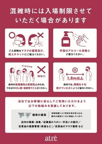 アトレでは、お客様ならびに従業員の健康と安全に配慮し、新型コロナウイルス感染防止対策として以下の取組みを実施しております。