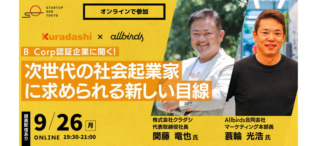 このたび、TOKYO創業ステーション 丸の内 Startup Hub Tokyoにお声がけいただき、「B Corp認証」について知っていただくことを目的に、「B Corp認証」取得企業である、Allbirds合同会社の蓑輪光浩⽒とクラダシの代表関藤竜也が登壇いたします。ソーシャルビジネスにおいて、「B Corp認証」を得ることにどんな意味があるのか、これからの社会起業家を⽬指す上でどのような視点を持つことが必要なのかなどをお話しいたします。ソーシャルビジネスで起業を⽬指している⽅の中で、起業アイデアのヒントを探している⽅や、ビジネスモデルを知りたい⽅などぜひご参加ください。