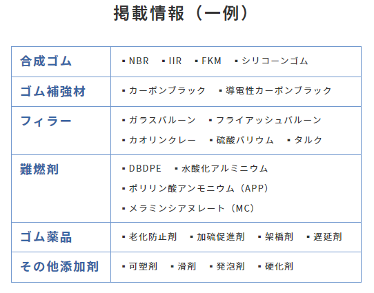 同サービスは、WEB情報だけでは知ることができない中国製原材料の情報をクラウド上で探索でき、合成ゴムや補強材、フィラー、ゴム薬品など800品種以上の原材料を24時間365日検索可能です。
