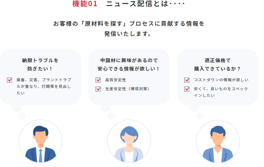 それに対して当社は、長年にわたる幅広い中国製原材料の取扱い実績があり、日本に在籍する中国人スタッフ4名が仕入先メーカーと直接交渉や材料メーカーの信頼性の見極めを行い、精度の高い情報を提供して参りました。