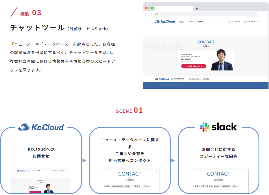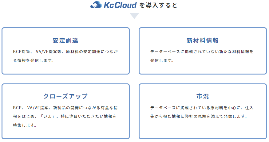 「KcCloud」を通じて、お客様が原材料を探すプロセスにおける課題解決に最後まで寄り添い「お客様の企業活動のさらなる高度化に努めてまいります。