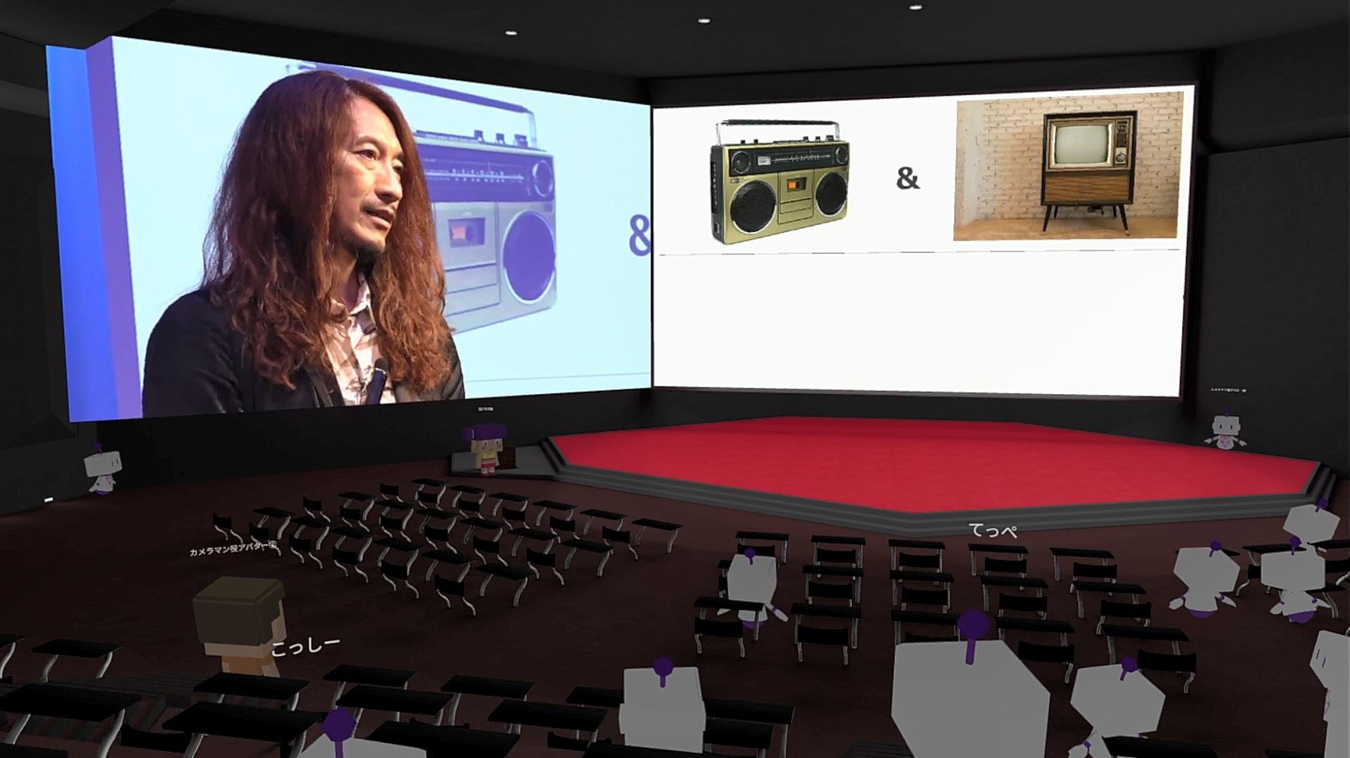 リアル会場内のLEDビジョンにはメタバース会場が投影され、そのメタバース会場内の大型スクリーンにはリアル会場が投影され、またそのリアル会場内の・・・という入れ子構造になった映像。それを見る参加者は、