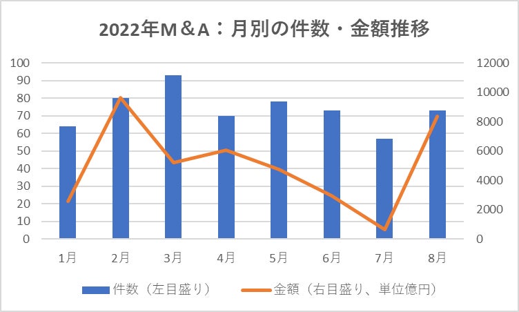 全体では73件と前年同月を8件上回った。8月として70件を超えるのは2019年(同数の73件)以来3年ぶり。海外案件が今年最多の月間21件に上ったことが件数を押し上げた。1~8月累計は前年同期比15件増の588件。8月の取引金額は8379億円で、2月に次ぐ今年2番目のレベル。オリンパスが顕微鏡などの科学事業を4276億円で売却するのをはじめ、上位にエイチ・アイ・エス(HIS)、三井化学による大型の売却案件が目立った。