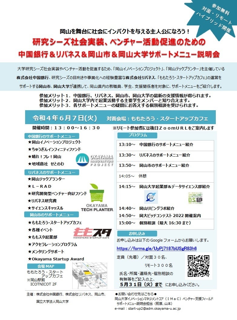 大学研究シーズ社会実装やベンチャー活動を促進するため、「岡山イノベーションプロジェクト」、「岡山テックプランター」を主催している株式会社中国銀行、研究シーズの目利きや事業化への経験豊富な株式会社リバネス、「ももたろう・スタートアップカフェ」の運営をサポートする岡山市、岡山大学が連携して、岡山県内の教職員、学生、支援関係者を対象に、サポートメニューをご紹介します。