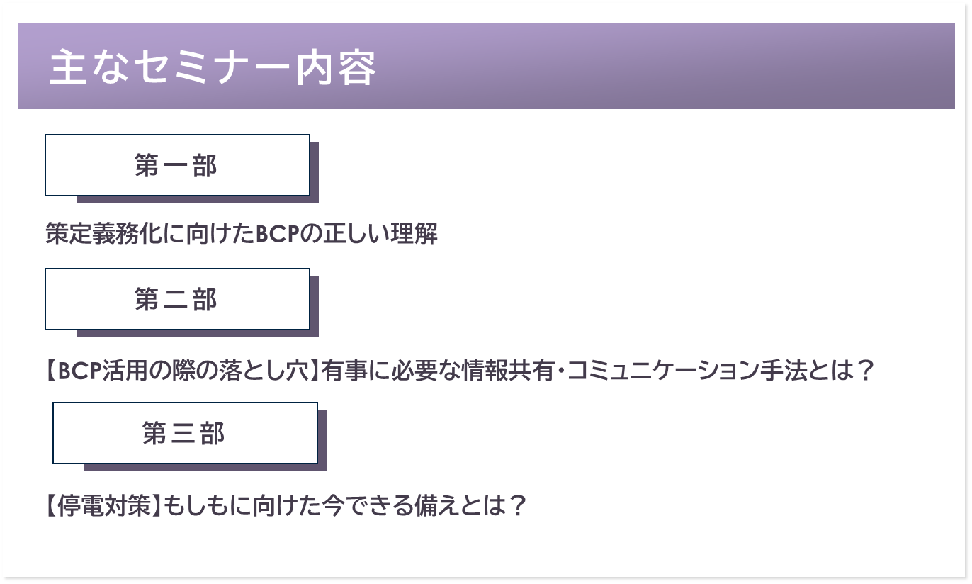 第一部ではBCP策定義務化についてのご説明で正しい理解を深めていただき、第二部ではBCP策定後の活用におけるコミュニケーション手法、第三部ではBCP策定の中でも必須項目である停電対策についてご案内いたします。