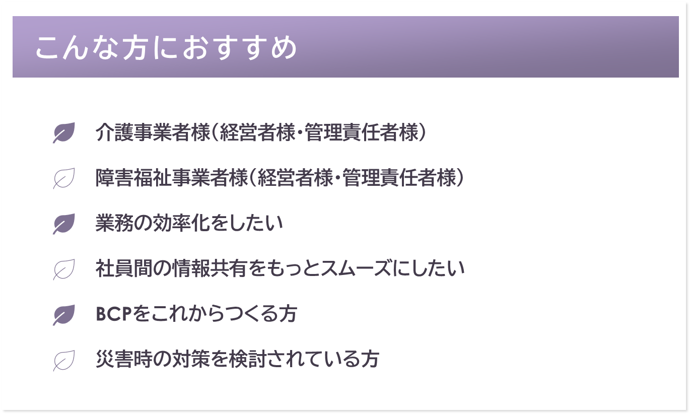 2021年4月施行「令和3年度介護報酬改定における改定事項について」内で、「感染症や災害が発生した場合であっても、必要な介護サービスが継続的に提供できる体制を構築する観点から、全ての介護サービス事業者を対象に、業務継続に向けた計画等の策定、研修の実施、訓練(シミュレーション)の実施等を義務づける」とし、2024年3月末までのBCP策定が義務づけられました。日本は災害大国として大きな台風や豪雨、地震等の自然災害を経験しております。加えて昨今では新型コロナウイルス感染症の拡大に伴い、事業所の利用者・職員を守るため、計画策定や日頃の訓練の実施は今まで以上に必要不可欠となっております。義務化まで残り1年半となりますが、BCP策定の内容にまだ不安を抱える事業者も多い状況であると思料しております。