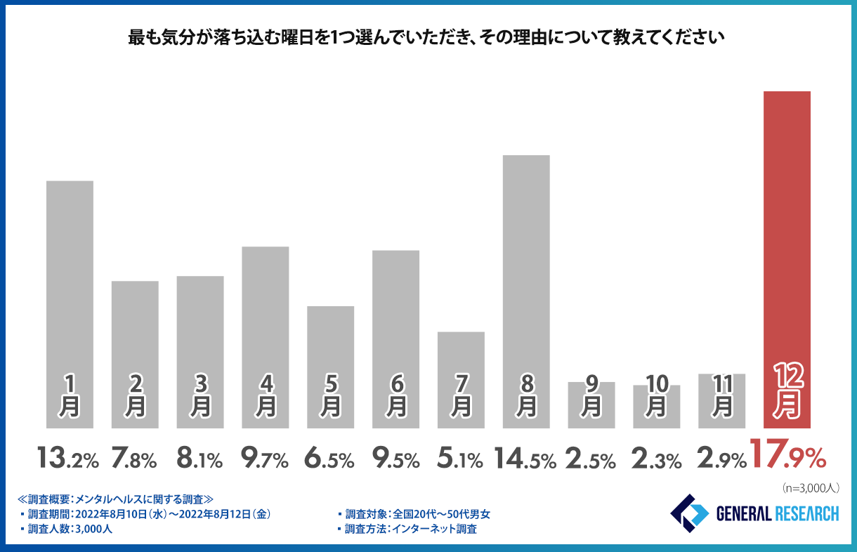 気分が落ち込む月では、『12月(17.9%)』『8月(14.5%)』『1月(13.2%)』『4月(9.7%)』『6月(9.5%)』と続きました。