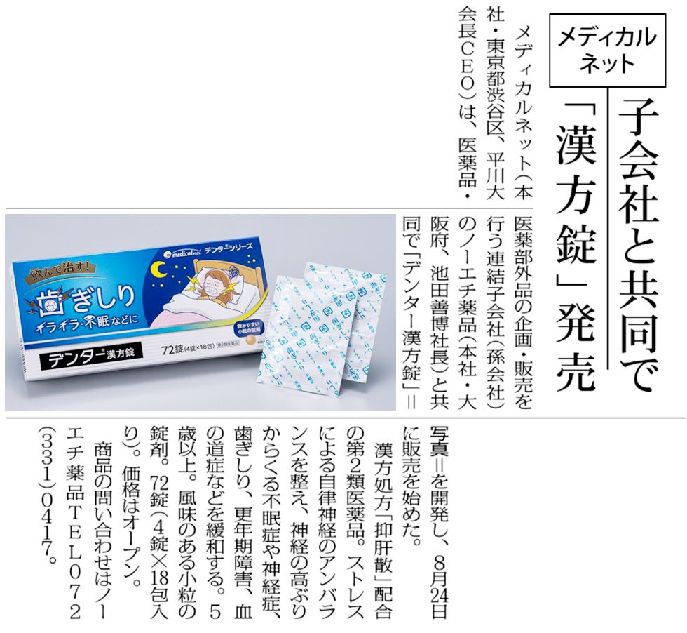 2022年9月6日発行の日本歯科新聞に、株式会社メディカルネット(本社:東京都渋谷区、代表取締役会長CEO:平川大、以下「当社」)が、当社の連結子会社(孫会社)であるノーエチ薬品株式会社(本社:大阪府松原市、代表取締役:池田善博、以下「ノーエチ」)と共同で、「デンター漢方錠」を開発・販売したことに関する記事が掲載されましたので、お知らせいたします。