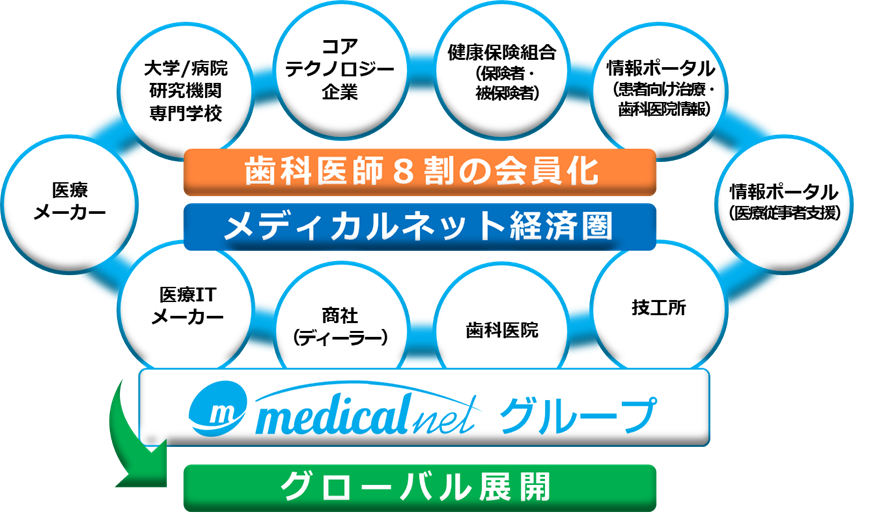 当社は「インターネットを活用し 健康と生活の質を向上させることにより 笑顔を増やします。」をミッションに掲げ、インターネットを活用した医療・生活関連情報サービスを提供しております。特に歯科医療分野においては、生活者への歯科医療情報サービスの提供、歯科医療従事者への情報サービスの提供、歯科医療機関の経営支援事業、歯科関連企業のマーケティング支援事業など歯科医療の総合ビジネス(プラットフォームビジネス)を展開して、メディカルネット経済圏の構築を目指しております。