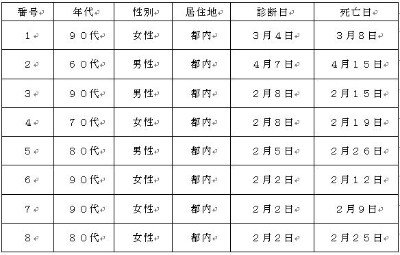 新型コロナウイルスに関連した患者の死亡について business Twitter Facebook はてブ Pocket LINE コピー 2022.05.26 この記事は約1分で読めます。 都内で新型コロナウイルスに感染した方が死亡されましたのでお知らせします。 お亡くなりになった方のご冥福をお祈り申し上げます。 ※ 患者・御家族の人権尊重・個人情報保護に御理解と御配慮をお願いします。