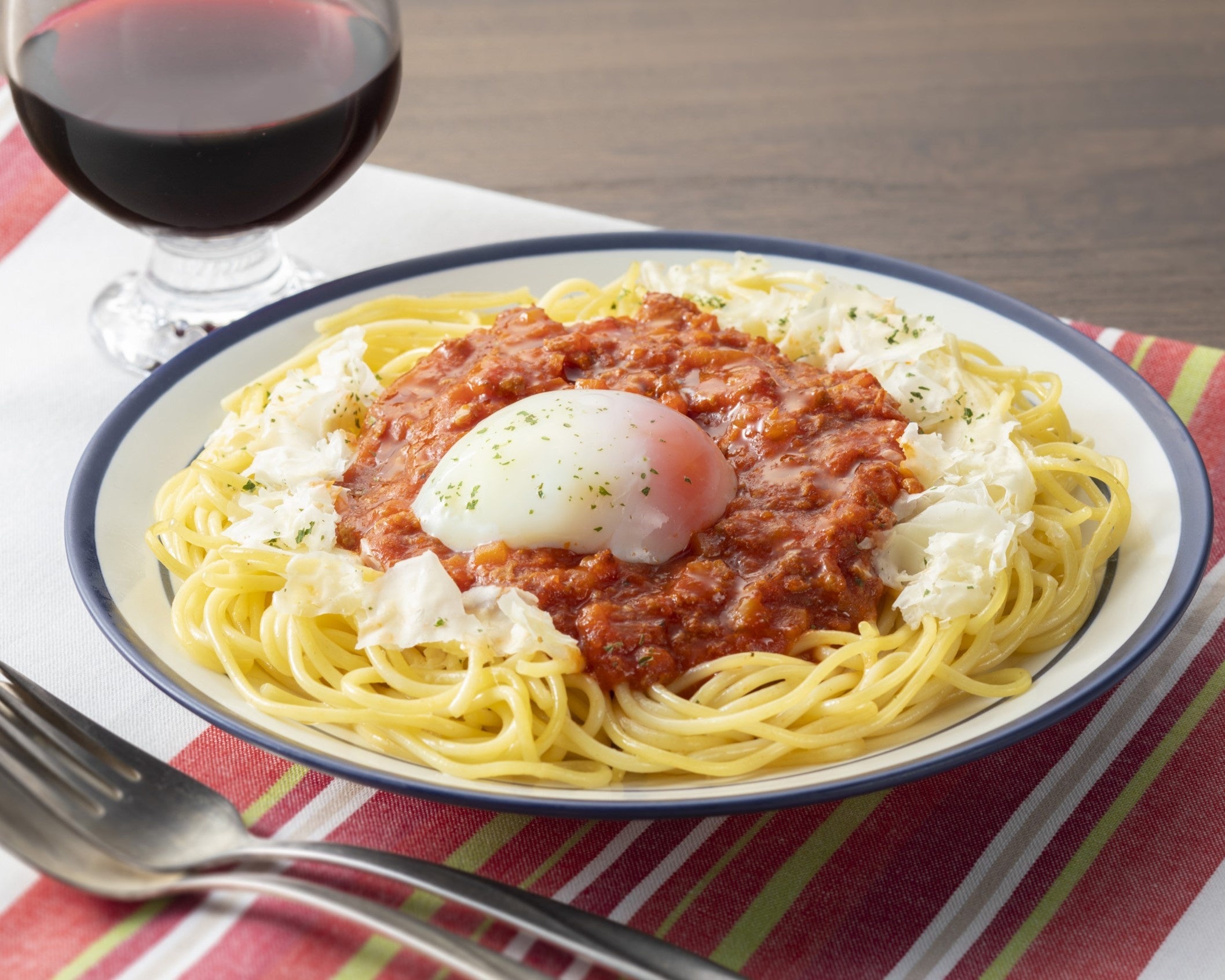店舗で提供しているメニューをもとに開発したこだわりのミートソースが、前回フェアでの好評を受けて再登場いたします。イタリアンの調理方法“ソフリット”により香味野菜をじっくり炒め、ひき肉、赤ワインをいれて煮込むことで、野菜の旨みを増幅させたソースが特徴。薄削りしたチーズと半熟玉子をトッピングしています。