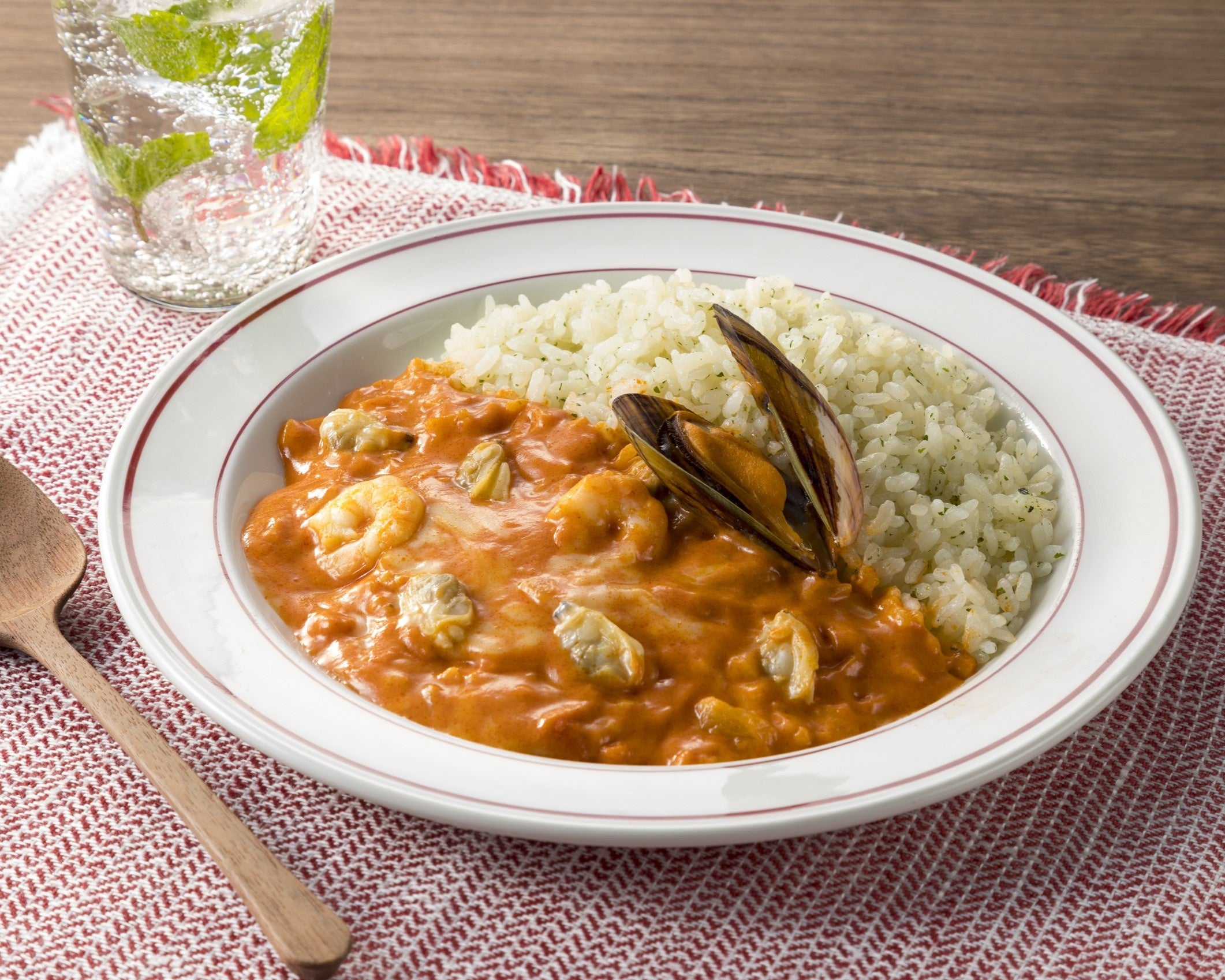 ピラフはバターの風味を感じる味わいのガーリックピラフ、ソースはトマトソースにホワイトソース、牛乳、チキンブイヨンで濃厚な仕立てにし、お店の味を再現しました。具材はムール貝、海老、アサリの海鮮を使用し、トッピングにはチーズを加え、旨みとコクが広がる味わいが楽しめます。