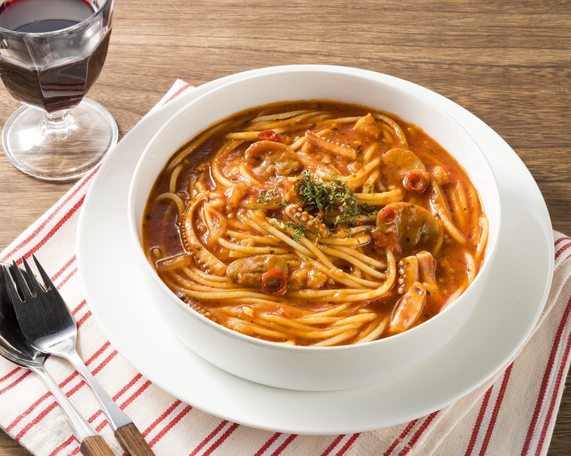 「イルキャンティ」でNo.1人気のメニューを再現したスパゲティです。トマトソースの中に辛味を組み合わせ、オリーブオイルやニンニクを効かせて忠実に味を再現。ソースをたっぷり使用し、本品の特徴であるスープパスタ感を表現しました。
