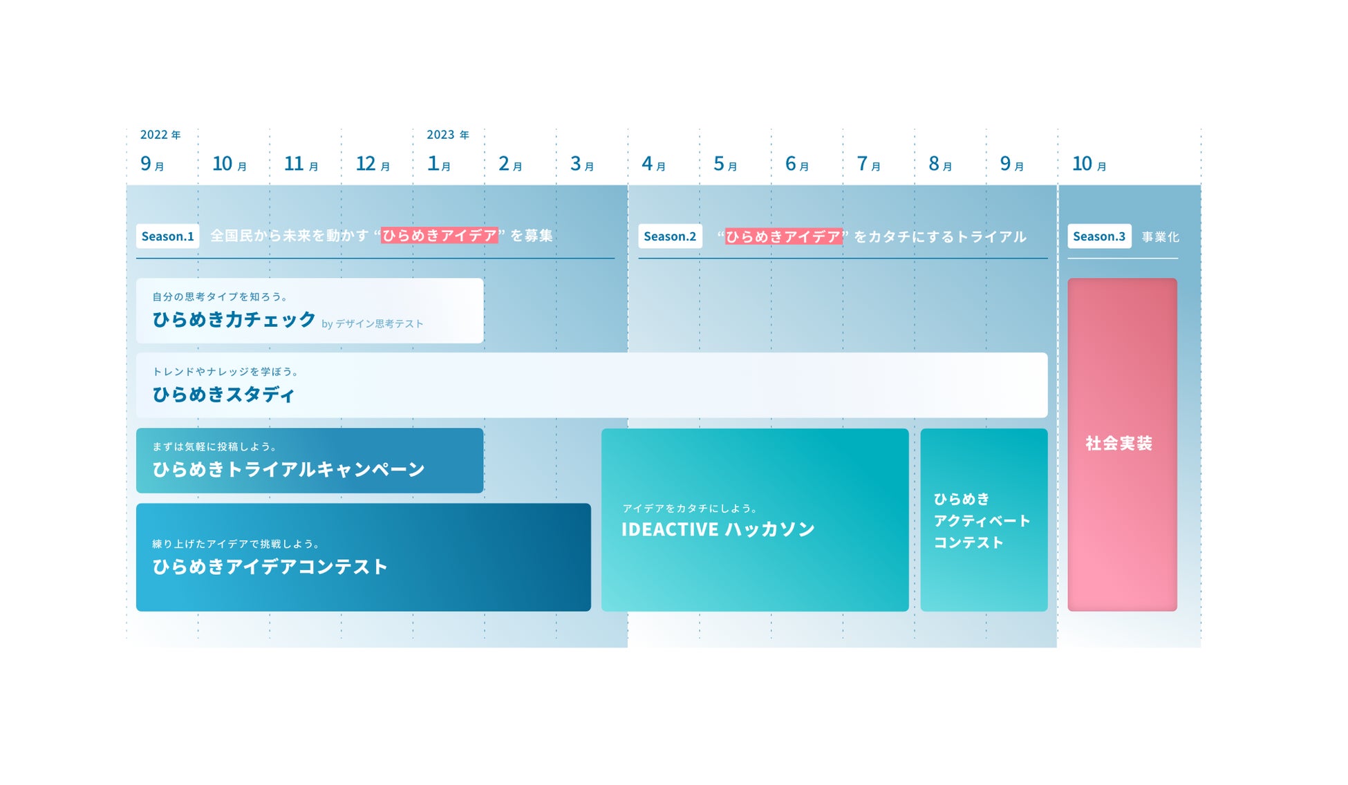 本プロジェクトはアイデアを創造するためのSeason.1とそのアイデアをカタチするためのSeason.2、さらには社会実装を支援し事業化するためのSeason.3の3つのフェーズから構成されます。