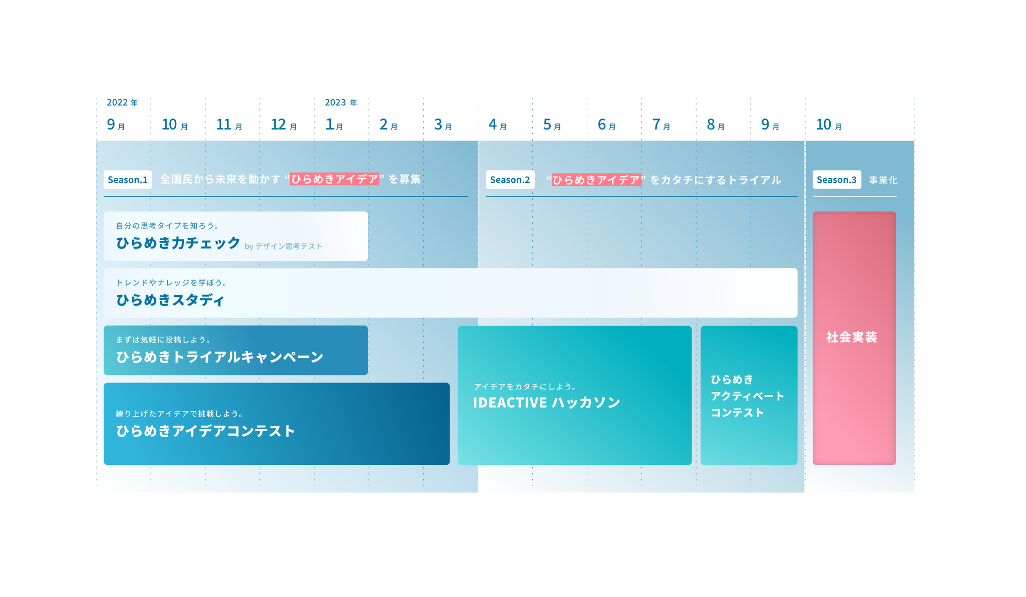 本プロジェクトはアイデアを創造するためのSeason.1とそのアイデアをカタチするためのSeason.2、さらには社会実装を支援し事業化するためのSeason.3の3つのフェーズから構成されます。