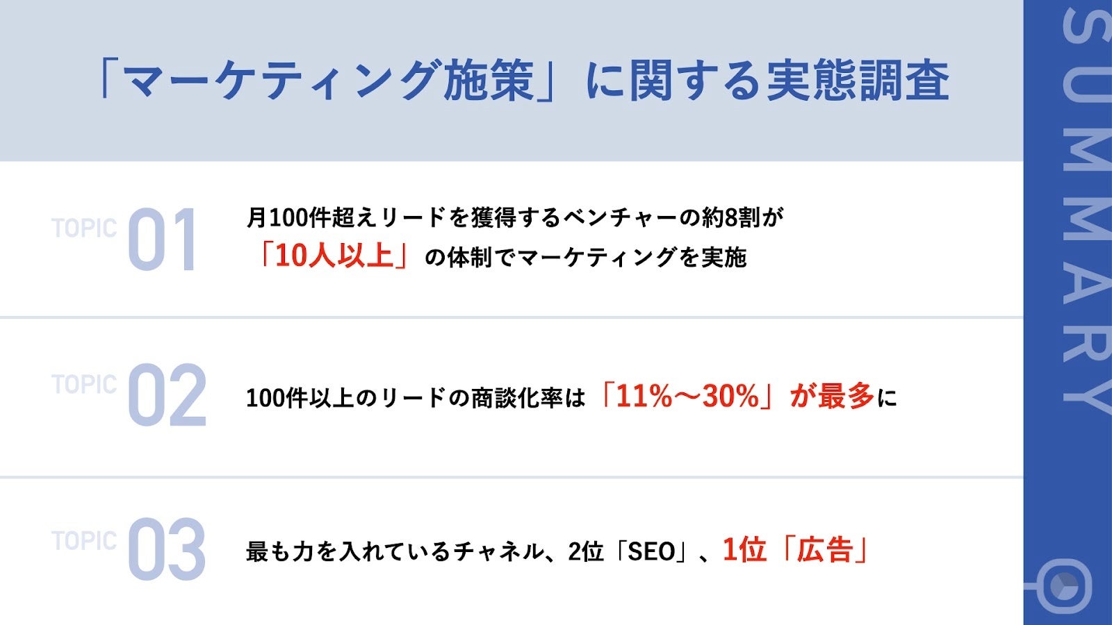 今回は、直近3年で平均して100件以上のリードを獲得したBtoBベンチャー企業のマーケティング担当者108名を対象に、「マーケティング施策」に関する実態調査を実施しました。