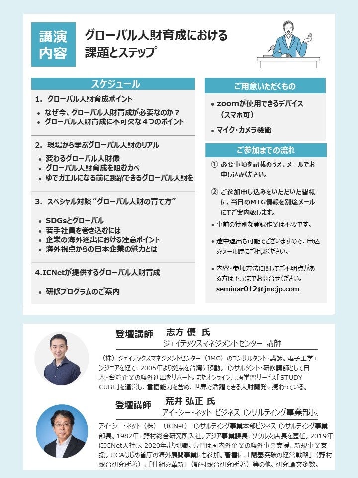 「世界で活躍する人財育成」をテーマとして、グローバル人財育成に求められるポイントをご案内します。