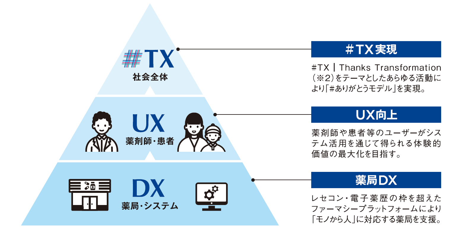 「(仮称)MAPs for PHARMACY DX」は、レセコン・電子薬歴の枠を超えた薬局DX(Digital Transformation)を通じて「モノから人へ」に対応した薬局をサポートし、薬剤師や患者のUX(User Experience=顧客体験)を高め、#TX(Thanks Transformation) (※2)を実現する「オールインワン・ファーマシープラットフォーム」です。