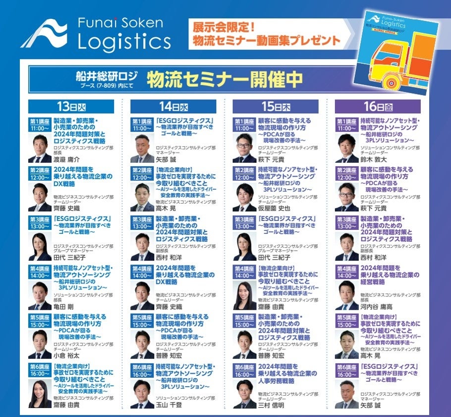 展示会の会期中 船井総研ロジのブース内で開催する全24セミナーのタイムスケジュールが発表されました。対策を急ぐ2024年問題や求められるESG(脱炭素)への取り組みなどをテーマに船井総研ロジのコンサルタントが講演いたします。