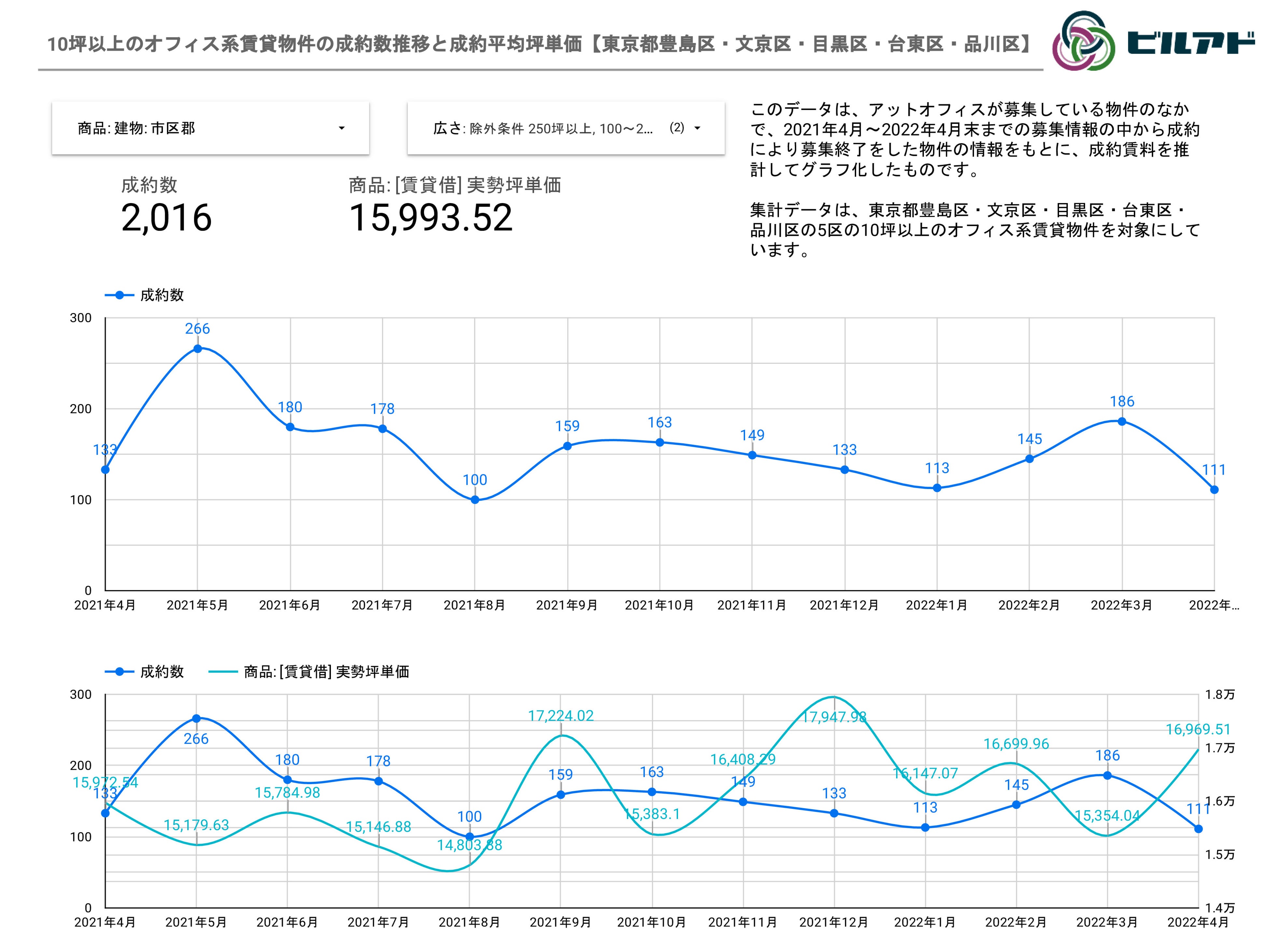 成約に至っている物件の成約単価も、上昇傾向にあります。ここで取り上げている5区の全体の平均も、2021年4月坪16310円→2022年4月は17615円と上昇しました。