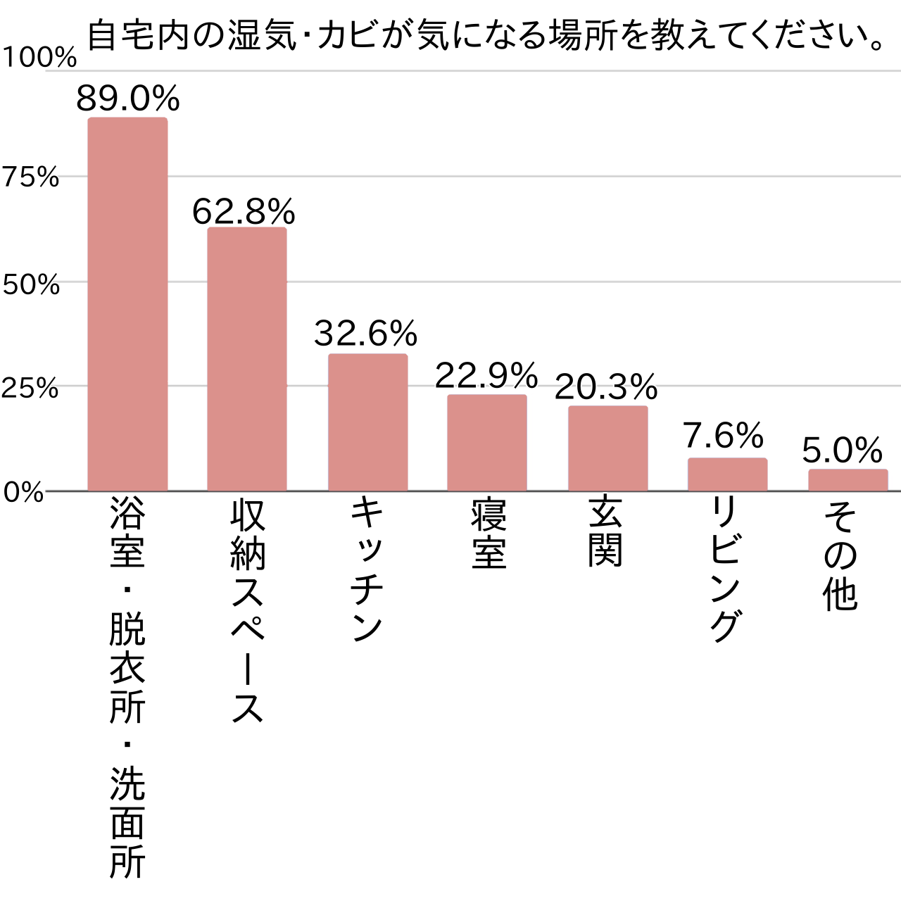 2番目に多かったのは「収納スペース(62.8%)」で、保管している衣服・カバン・寝具等にカビが発生しないか気になる方が多いようでした。