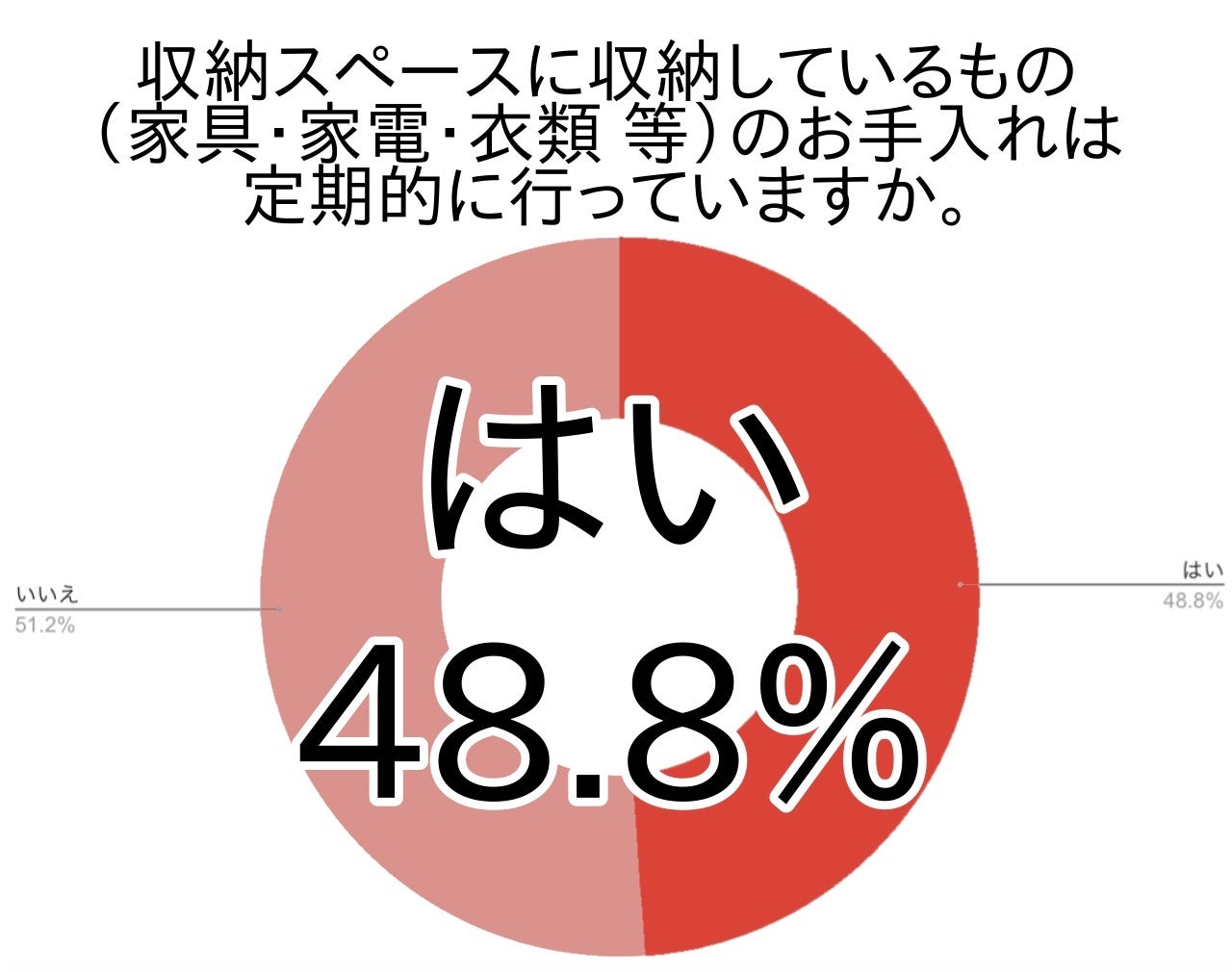 収納スペースの収納物(家具・家電・衣類等)のお手入れを定期的に行っていると答えた方は半数弱の48.8%でした。お手入れを定期的にできていない方が半数をわずかに超えており、気になりながらもなかなかできていない方が少なからずいると推測されます。