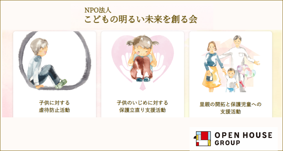 オープンハウスグループは、よりよい住まいを提供する会社として、他人の眼が届かない家庭内で辛い想いをしている子どもたちが少しでも減るよう、この活動に1千万の寄附を決定しました。今後も、児童虐待の撲滅にむけて、微力ながら、尽力してまいりたい所存です。