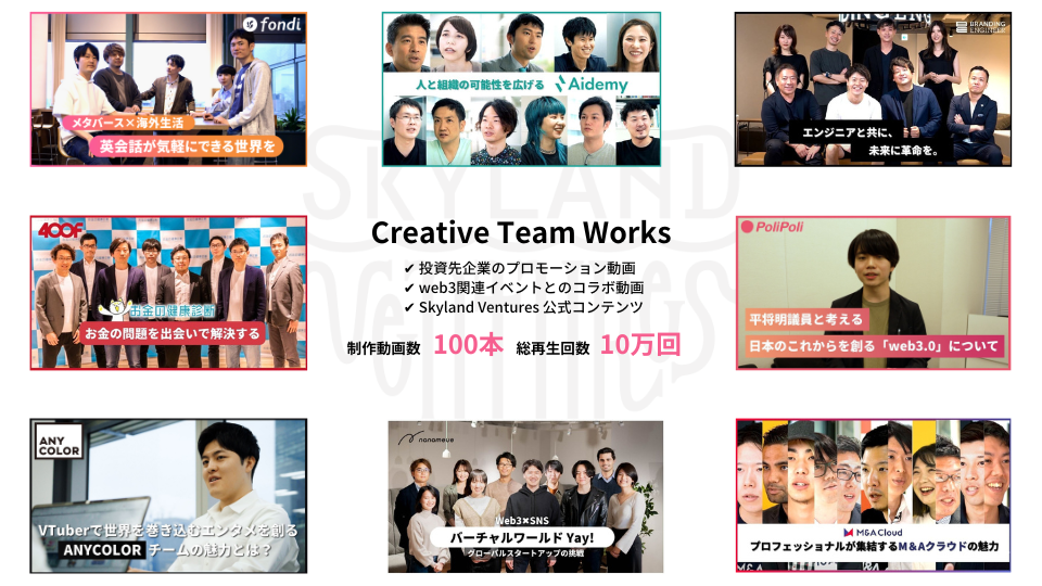 現在のクリエイティブチームのメインとなる活動はグローバルでの躍進を目指す・M&Aや政治領域など大きな社会問題に挑戦するスタートアップを世の中に広げる動画を制作しています。新たな投資先支援の形態を強化するとともに、SNSインフルエンサーや動画メディアと次々コラボしていくことで当チームを起点にして外部連携を促進する取り組みも行っております。