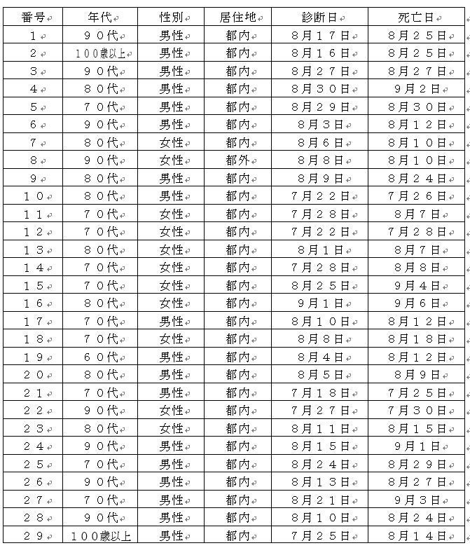 新型コロナウイルスに関連した患者の死亡について business Twitter Facebook はてブ Pocket LINE コピー 2022.09.10 この記事は約1分で読めます。 都内で新型コロナウイルスに感染した方が死亡されましたのでお知らせします。 お亡くなりになった方のご冥福をお祈り申し上げます。 ※ 患者・御家族の人権尊重・個人情報保護に御理解と御配慮をお願いします。