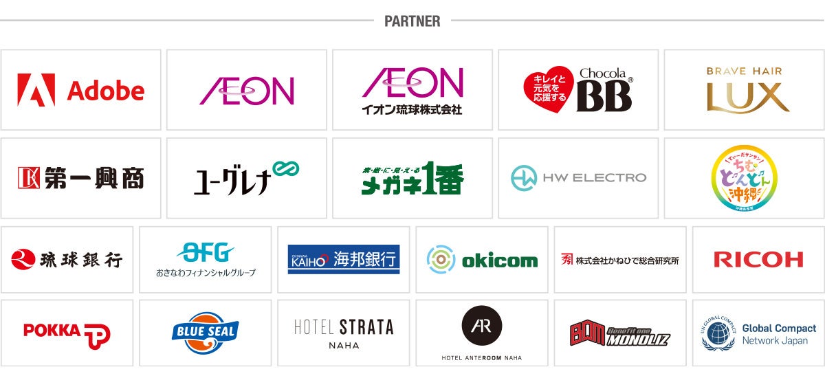 <協賛>アドビ株式会社/イオン株式会社/イオン琉球株式会社/チョコラBB/LUX/株式会社第一興商/株式会社ユーグレナ/株式会社メガネ一番/株式会社琉球銀行/株式会社沖縄ファイナンシャルグループ/株式会社沖縄海邦銀行/株式会社okicom/株式会社かねひで総合研究所/リコージャパン株式会社/株式会社沖縄ポッカコーポレーション/ブルーシールアイスクリーム/BENEFIT ONE MONOLIZ/沖縄UDS株式会社/ホテルストレータ那覇/ホテルアンテルーム那覇