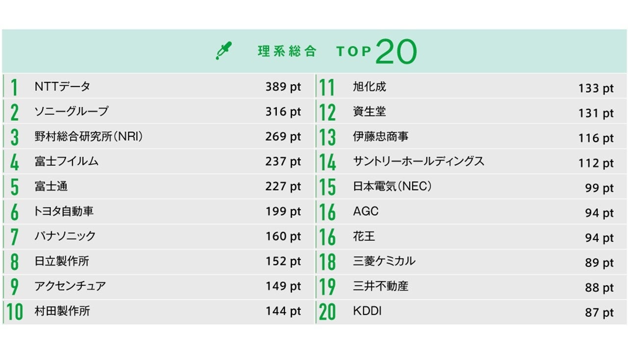 理系総合では、1位に「NTTデータ」、2位に「ソニーグループ」がランクインした。NTTデータは、新規システムに関するグループワークを行うワークショップ型と、事業を体験するプロジェクト型の2種類のインターンシッププログラムで約700名の参加者を募集。さらに24卒学生向けには、SIer業界研究や内定者コメントの動画をYouTubeに掲載するなど、規模、内容ともに、学生に満足感を与える情報発信が魅力。