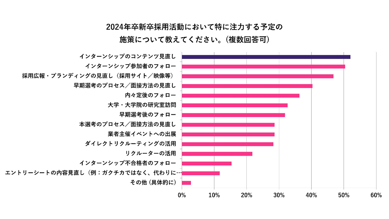 23卒の採用において、多くの企業から聞かれた課題の一つが、具体的な仕事内容の理解や事業の強み、独自性などの訴求。インターンシップをはじめとした企業側の情報発信の質は、そういった課題の解決も関係していると考えられ、調査でもインターンシップコンテンツの見直し、早期選考のプロセスの見直しに注力したと回答する企業は少なくない。