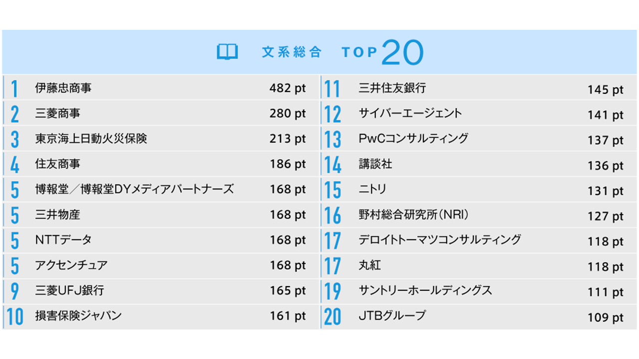 また、1位に「伊藤忠商事」、2位に「三菱商事」、4位に「住友商事」と、「総合商社」の人気も高い。