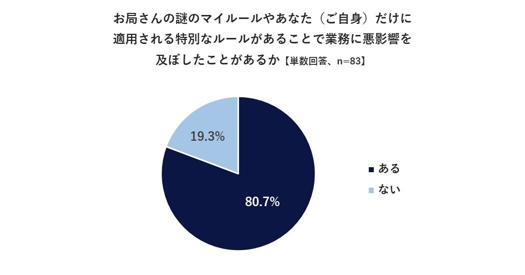 Q2「謎のマイルールを周りの社員に押し付けている」「あなた(ご自身)だけ適用される特別ルールを勝手に作っている」を回答した方へ、ルールによって業務に悪影響を及ぼしたことがあるか聞いたところ、80.7%の方が「ある」と回答し、8割の方に悪影響を及ぼしていることがわかりました。