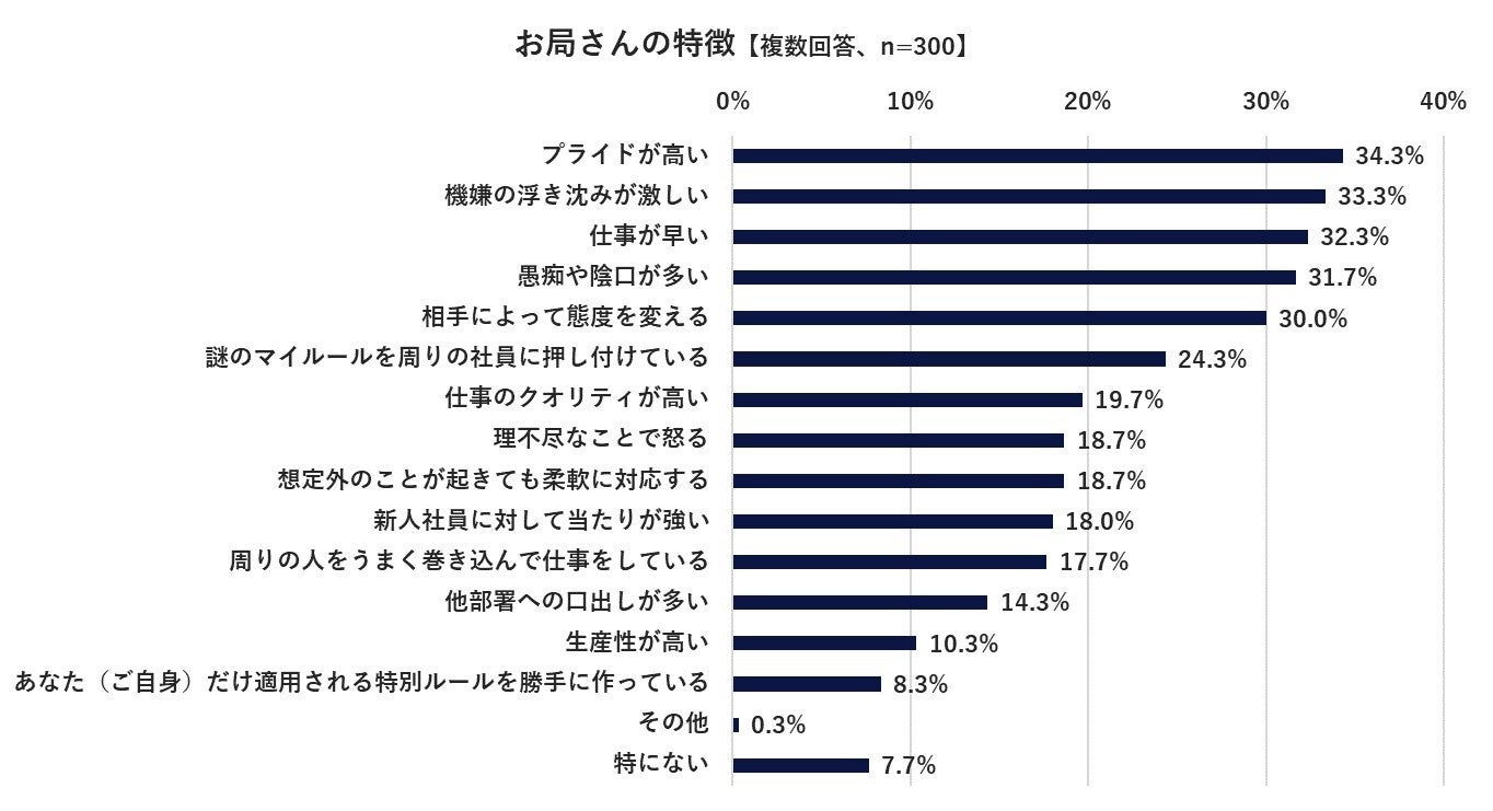 「お局さん」という言葉は、ネガティブなニュアンスを込めて使用されることが多い言葉ですが、今回の調査結果では、職場にいる最も多いお局さんの属性は、「仕事ができる”プロフェッショナルお局さん”」52.0%でした。一方で、回答者が勤める会社にいるお局さんの特徴として最も多かったのは、「プライドが高い」34.3%、次いで「機嫌の浮き沈みが激しい」33.3%で、ややネガティブ寄りの特徴が目立ちました。職場に長く勤めているが故に、仕事の正確性が高く、スピードが早い一方で、周りの社員からは、他人の意見を素直に受け入れる柔軟性がやや低いと思われることがあるのかもしれません。