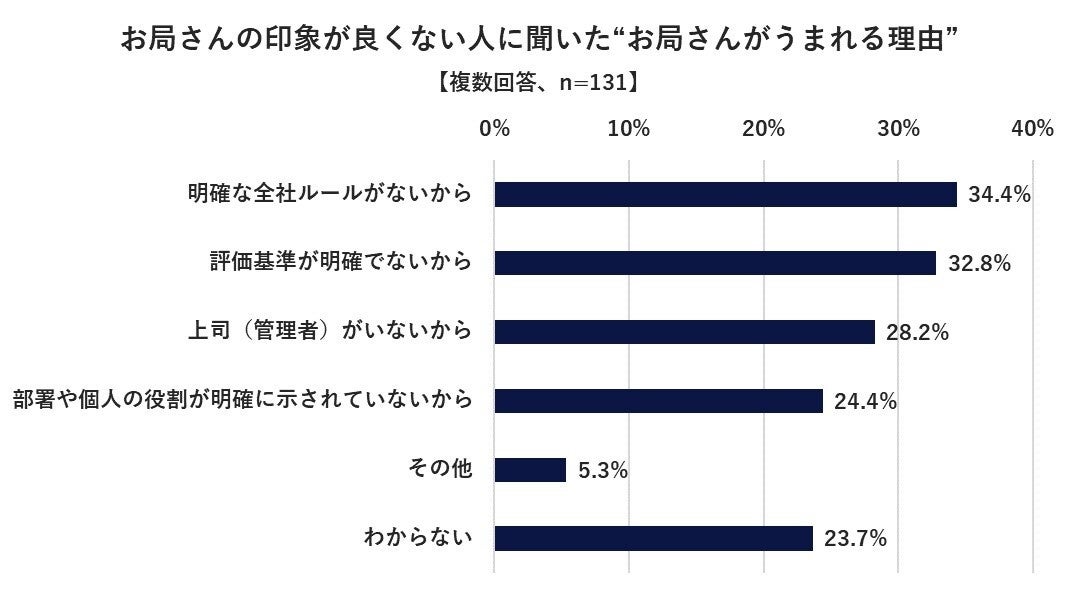 一方で、お局さんの印象が良くないといった回答もありました。プロフェッショナルなお局さんが多いなか、お局さんの印象が良くないと回答した方へ、お局さんがうまれる理由を聞いてみると「明確な全社ルールがないから」34.4.%、「評価基準が明確でないから」32.8%という回答が多く集まりました。企業は、業務に明確なルールを設け、評価基準を社員に明示することで、有能なお局さんの能力を最大限に活かしつつ、企業の生産性を高めることができるかもしれません。