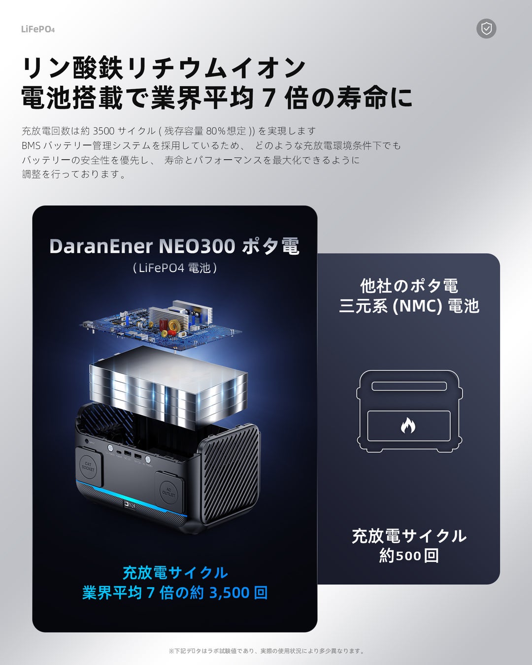 【長寿命・安全性に優れたリン酸鉄リチウム電池搭載】DaranEner ポータブルバッテリー NEO300はより優れた耐熱性を持つ新世代のリン酸鉄リチウム電池(LiFePO4電池)を採用するために、リチウムイオン電池に比べて約7倍の長寿命(充放電回数は約3500サイクル(残存容量80%想定))を実現します。電圧、電流、短絡、温度などをリアルタイムに監視および調整するBMSバッテリーシステムを採用しているため、さまざまな充放電および環境条件下での安全なオペレーション、パフォーマンス、およびバッテリー寿命・効率性を支えます。